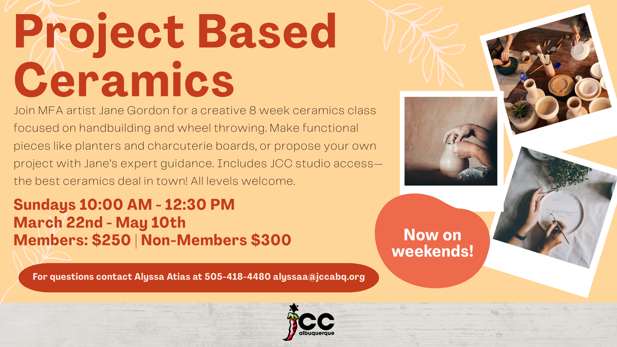 Join MFA artist Jane Gordon for a creative 8 week ceramics class focused on hand building and wheel throwing. Make functional pieces like planters and charcuterie boards, or propose your own project with Jane’s expert guidance. Includes JCC studio access—the best ceramics deal in town! All levels welcome. For more Information contact Alyssa Atias, Youth & Family Director